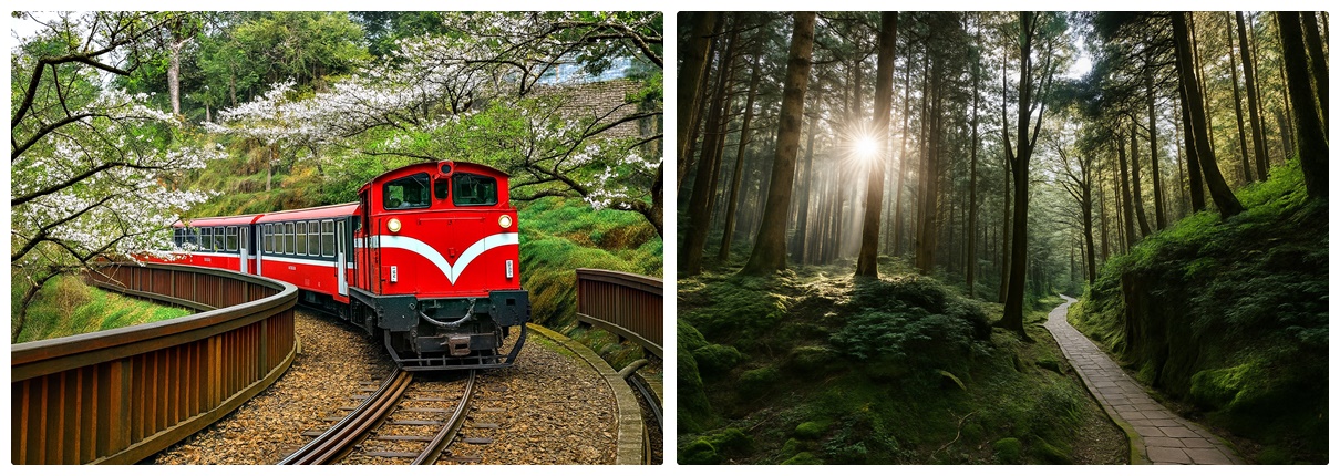 百年歷史的窄軌小火車,帶您穿越神木群和竹林,登上海拔 2000 公尺的觀日平台,感受阿里山的日出和雲海奇景。