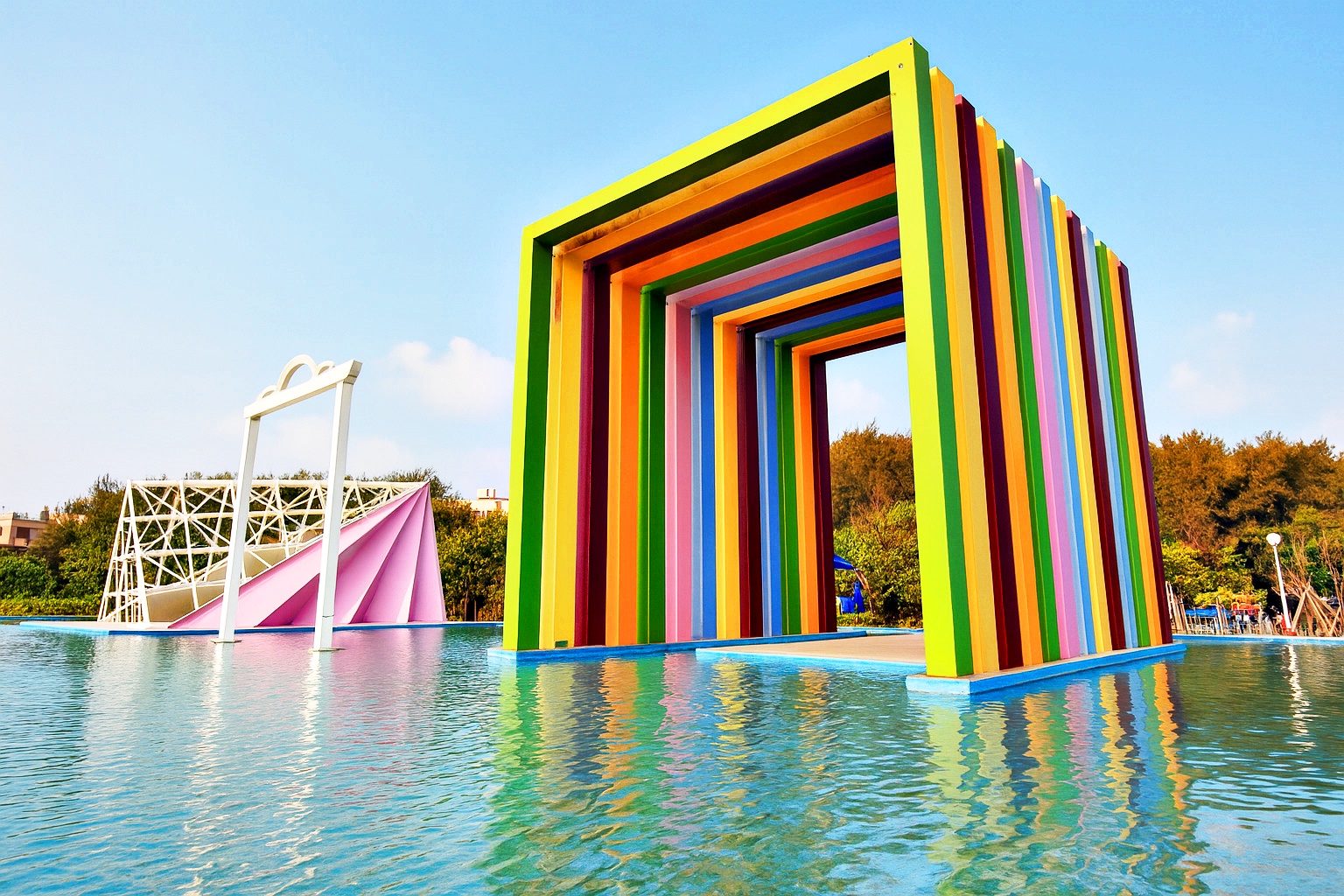 以彩色玻璃造型打造的裝置藝術,外觀如婚禮殿堂般浪漫,吸引許多情侶前來拍照打卡,特別適合黃昏時分取景。